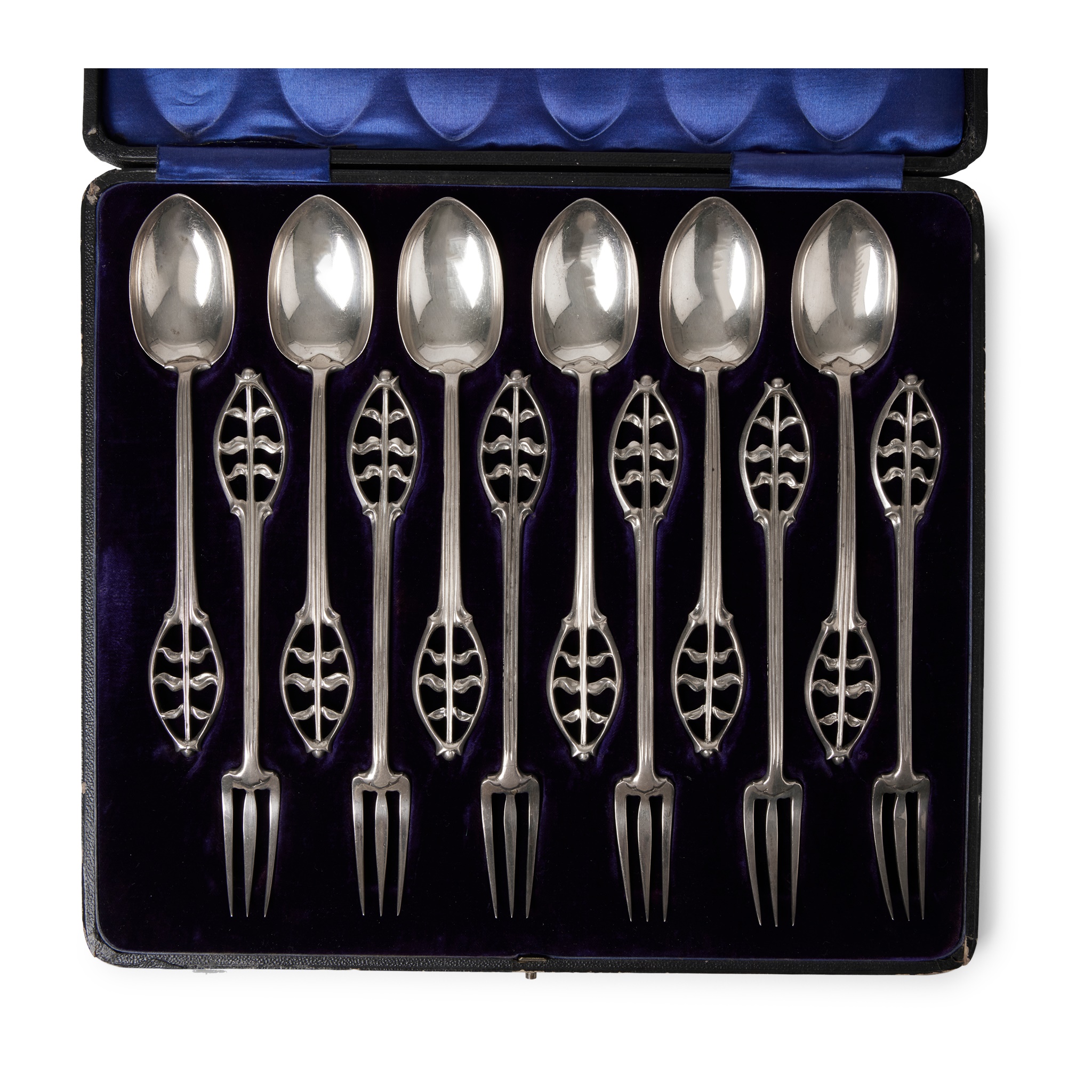 silver, comprising six forks and spoons, boxed, stamped WB, hallmarked London 1912, box gilt printed W.A.S. BENSON & Co. LTD, 82 & 83 NEW BOND ST, LONDON