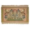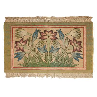 Note: In 1875, Morris & Co. began large-scale production of floor coverings, rugs and carpets, designed to complement an ever-popular ‘Morris’ aesthetic in Victorian Britain. A triumph in craftsmanship on an impressive scale, these designs were hailed as some of the finest hand-knotted carpets ever produced in Britain at the time. Morris’ designs were largely inspired by his love of Eastern carpets from Persia Turkey and China, of which he amassed a great deal and used to furnish his own homes, including Red House. Featuring an array of stylised plants and flowers, carefully woven into fields of vibrant colours, the carpets were hugely popular but very expensive to the average customer. As a result, the firm began to manufacture a range of smaller and less costly alternatives to an eager market. Flowerpots were often a feature of these designs, with trailing flowers stemming out from the centre against a cream ground, and a dark blue border. These smaller rugs were frequently used as wall hangings and occasionally placed as bedside rugs in guest bedrooms.