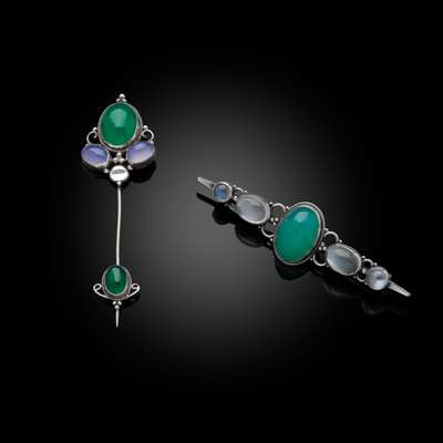 comprising a BAR BROOCH, white metal set with moonstone and chrysoprase cabochons, 6.6cm long; and a PIN BROOCH, white metal set with moonstone and chrysoprase cabochons, 7.1cm long