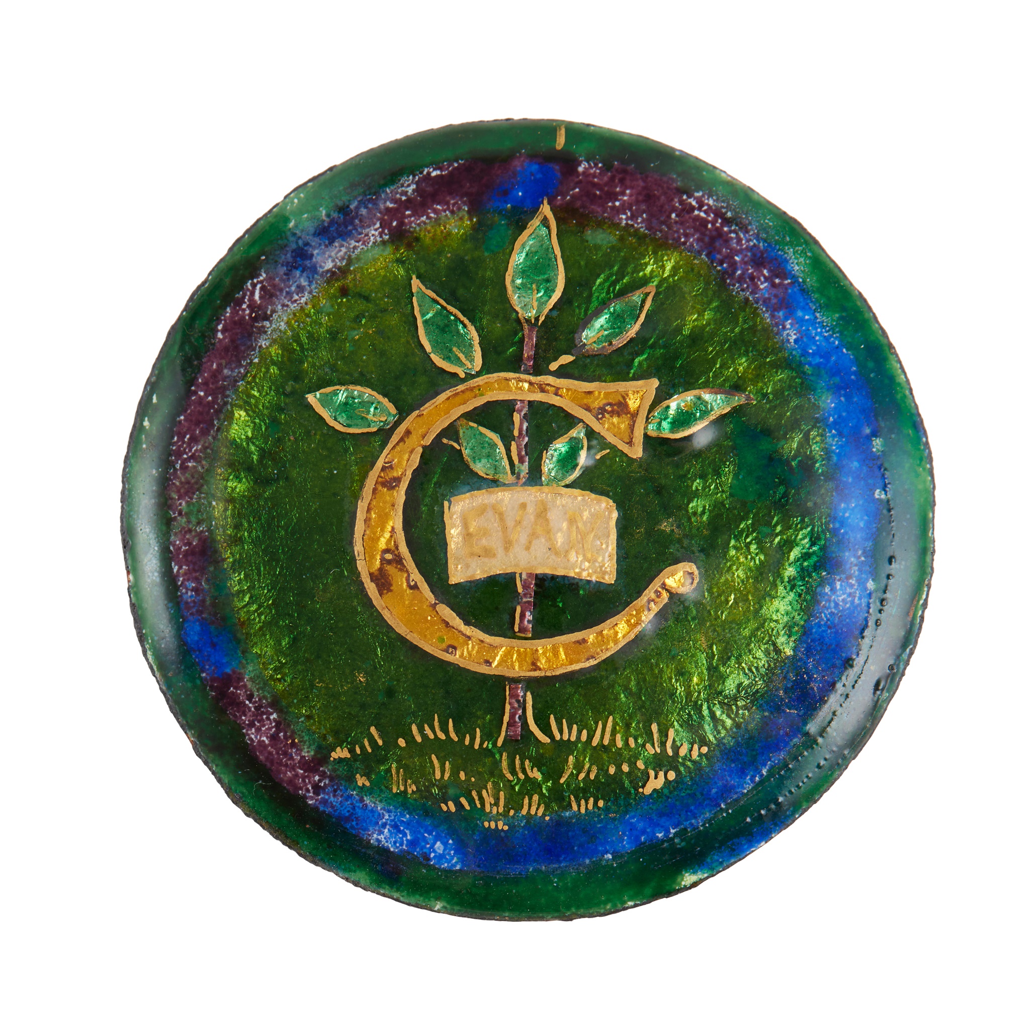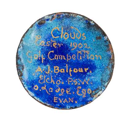 One of these sporting weekends was held at Clouds, the home of Percy and Madeline Wyndham, at Easter in 1902 and is the subject of the current lot. Percy Wyndham bought the Clouds estate in 1876, and he and Madeline set about demolishing the existing late eighteenth-century house and building a new one, designed by Philip Webb between 1881 and 1885 and decorated by Morris & Co. Madeline Wyndham was an artist in enamels, embroidery and watercolours, however from the mid-1890s she concentrated on enamelling. Madeline was closely associated with the enamellist Alexander Fisher and became one of his most talented pupils; she also used her influence to further his career. It was an expensive hobby and appealed more to aristocratic women, some of whom installed furnaces in their homes. Indeed, Fisher procured a furnace for Madeline from a Parisian firm and had it installed at Clouds in 1901, where this medal was probably fired. The participants in the Golf Competition at Easter 1902 are inscribed verso on the current lot - they are 'A.J. Balfour' (later to be Prime Minister); 'Elcho' (Lord Hugo Elcho,11th Earl of Wemyss & March); P.S.W. (Percy Wyndham); 'O. Lodge' (Sir Oliver Lodge); 'Ego' (Lord Hugo Elcho) and 'Evan' (Evan Charteris, presumably the winner).