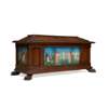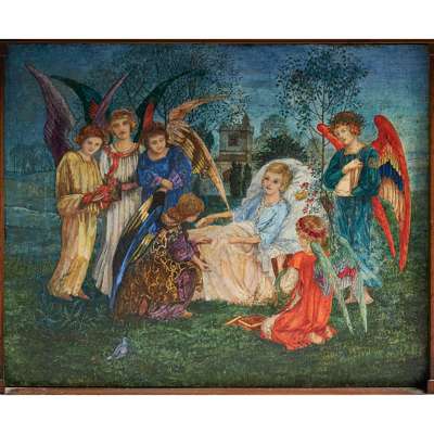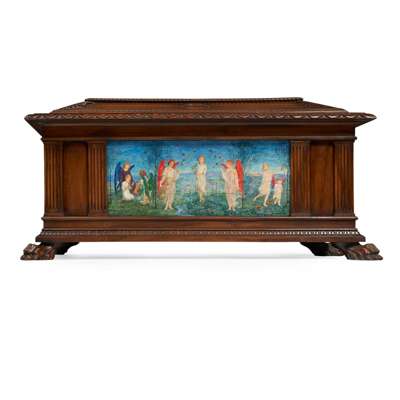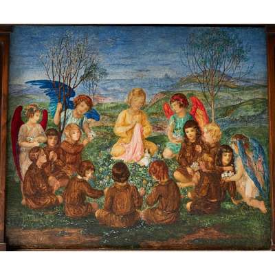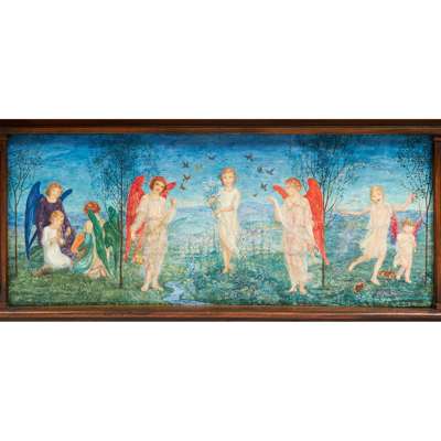 walnut, inset with allegorical panels, Visited by Angels, Gathering Spring Flowers, and Among Children, oil on board, the front panel signed DAPHNE ALLEN