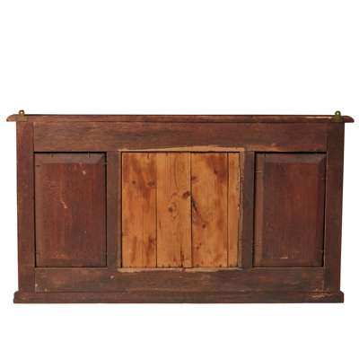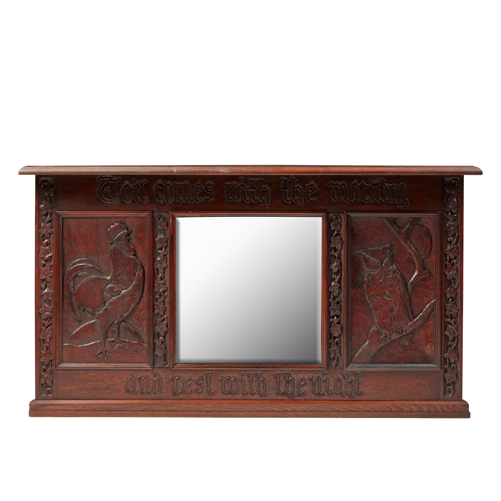 oak, with bevelled mirror plate, carved inscription TOIL COMES WITH THE MORNING AND REST WITH THE NIGHT