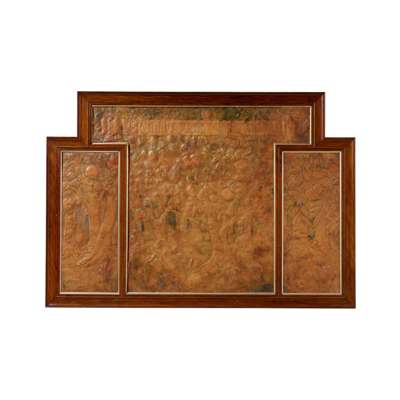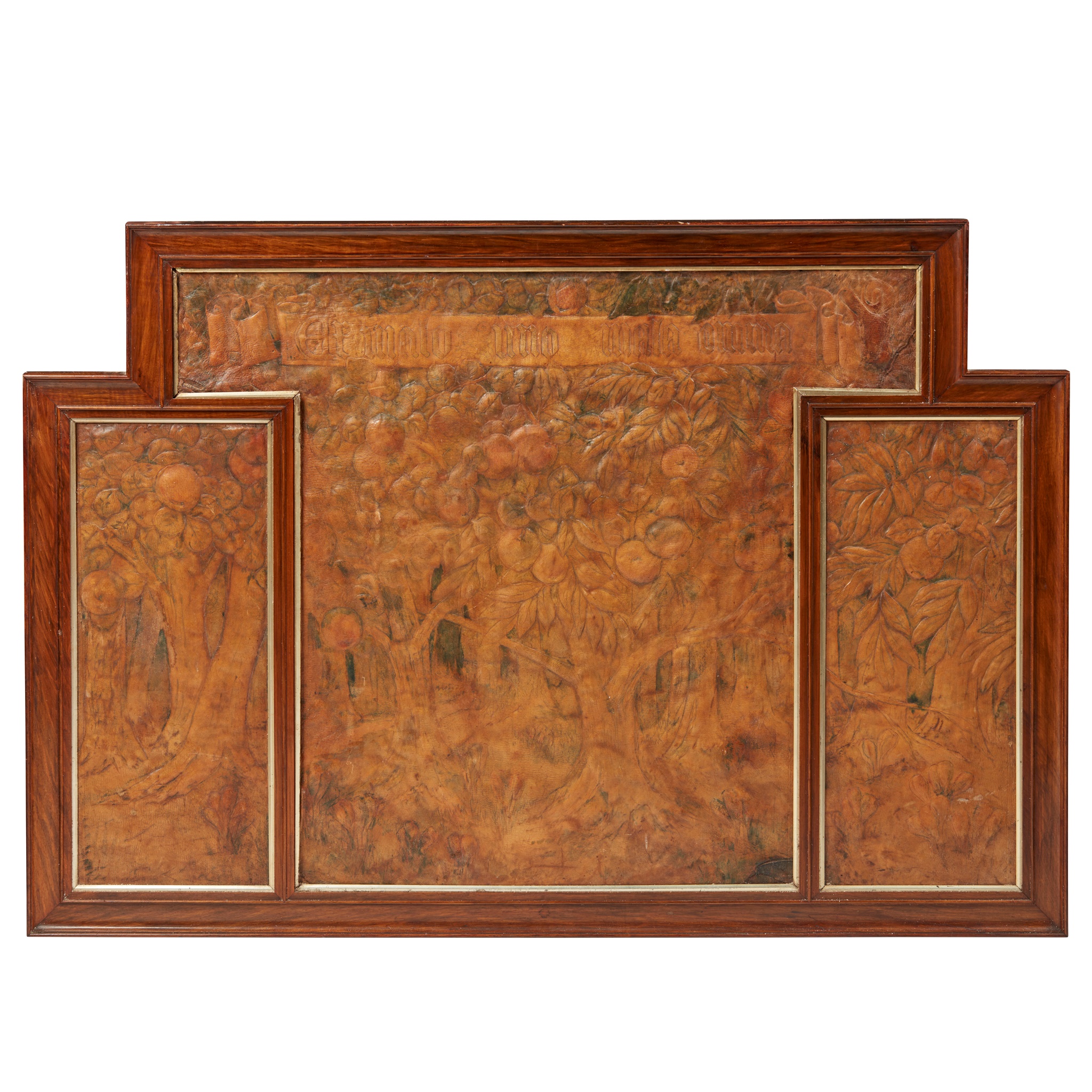 embossed and coloured leather, within walnut frame, bears paper label verso Property of A. Neville-Rolfe, Lt. 5th Gurkhas/ Leather panel by Ada Neville-Rolfe/ Beacham, Norfolk/ Framed by The Sandringham Workshops 1912