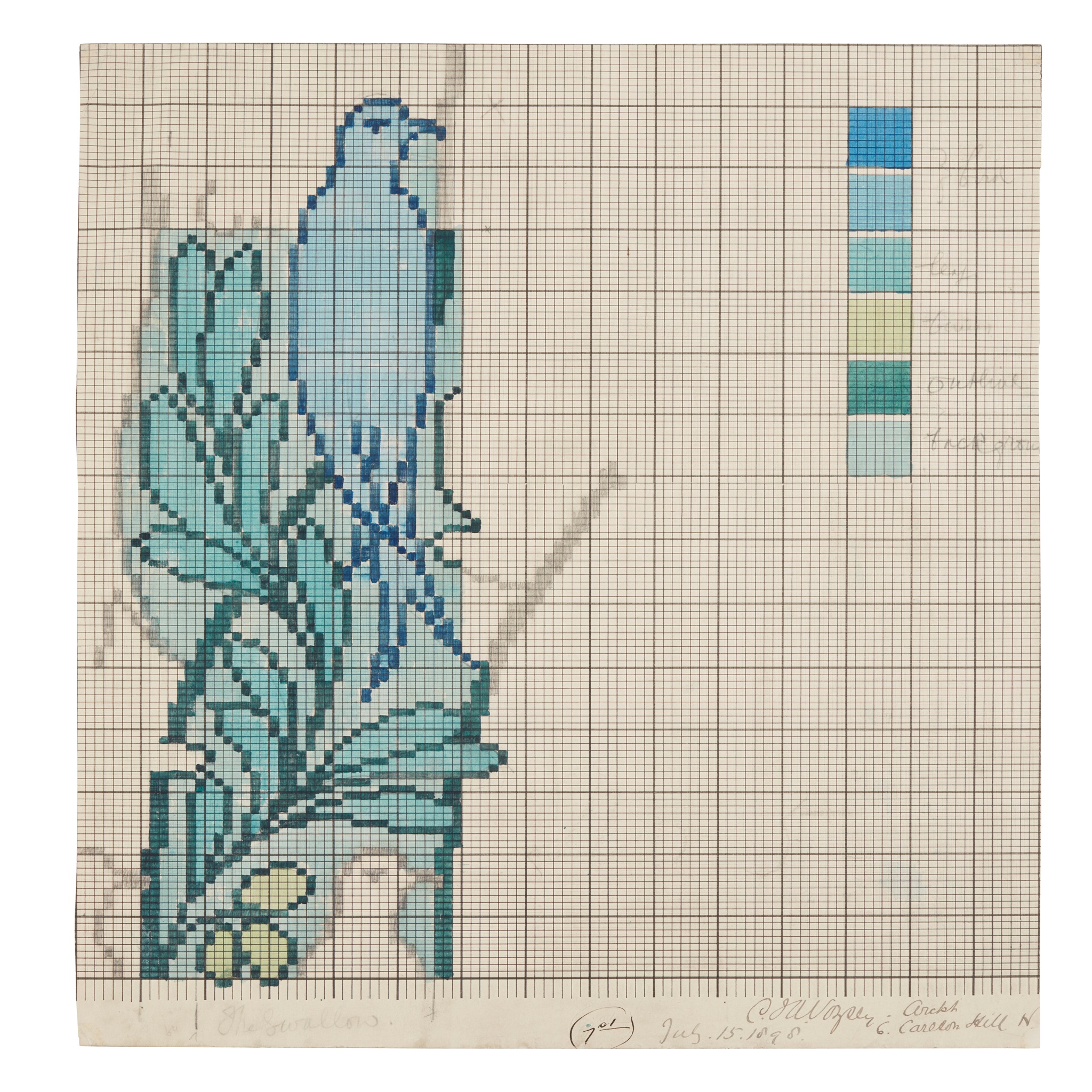watercolour and graphite on squared paper, depicting a bird on a branch, signed and inscribed in ink C. F. A. VOYSEY/ ARCHT/ 6. CARLTON HILL. N.W./ THE SWALLOW, JULY 15, 1898 and with inscribed colour key, bears printed Tomkinsons Carpets Ltd. stamp verso