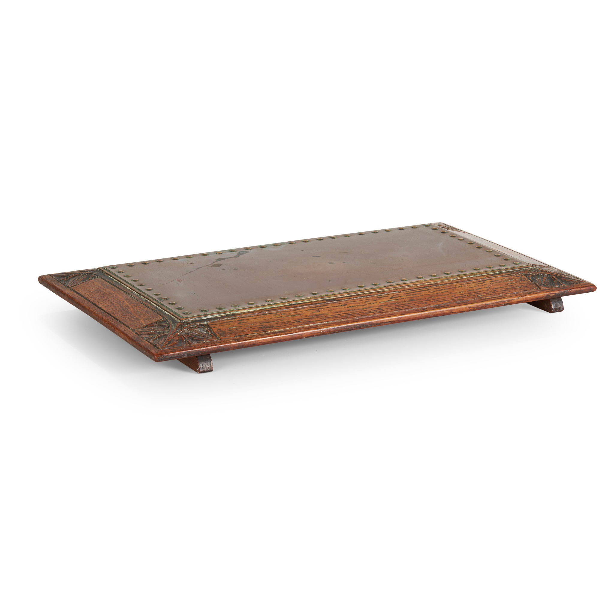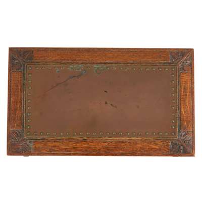 oak, inset with a riveted copper panel, stamped 7182
