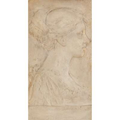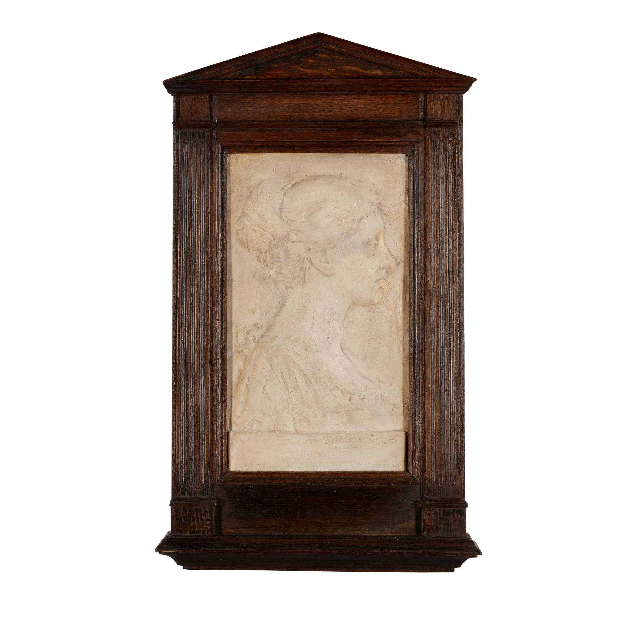 plaster relief panel, within the period oak frame, relief moulded inscription MILLICENT MARGARET FISHER/ HENRY ALFRED PEGRAM FECIT