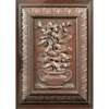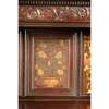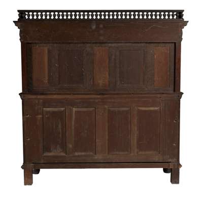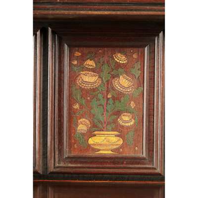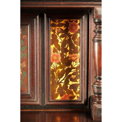 stained and carved oak, inset with gilded and painted panels, carved 1873 to frieze