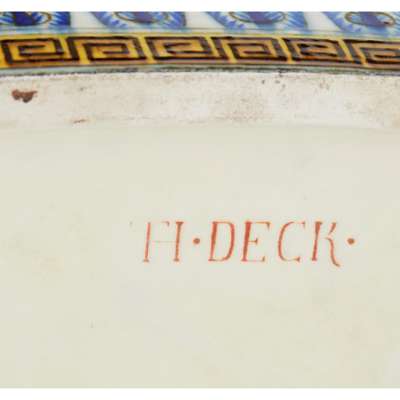 Deck’s obituary in the New York Times recognises that it was "at the Exhibitions of Decorative Arts, in Paris in 1880 and 1884, [that] he attained world-wide celebrity with his vases, red, turquoise, Deck blue, and other colors (sic), limpid, profound, and dazzling." A committed aesthete, "Deck died at Sèvres, in the little pavilion-with rooms of gold, satin, and velvet, filled with vases painted in manganese violet and eel yellow colors (sic), lacquers, netsukes, and swords of Japan…. He was inseparable from his surroundings; he wore the air of their art and charm as if he had been born among them."