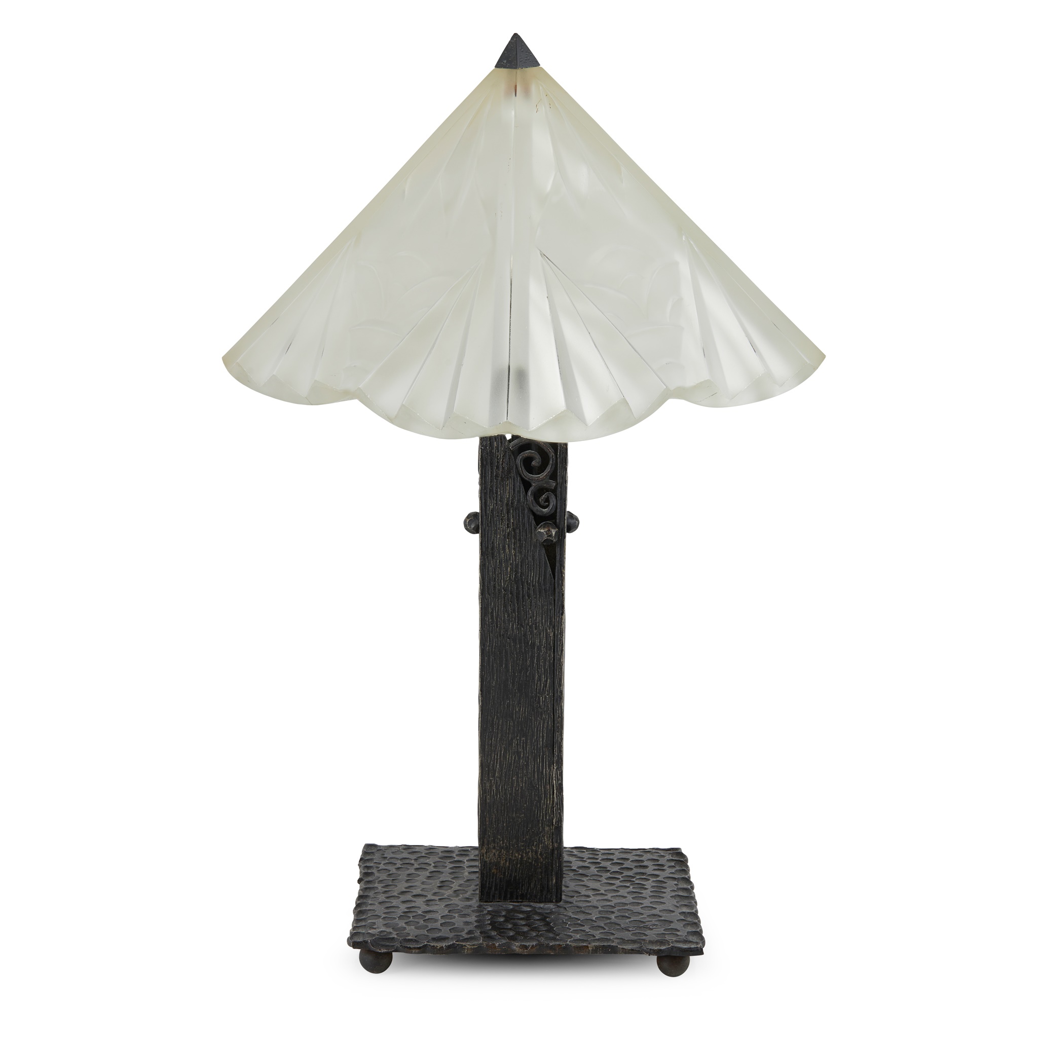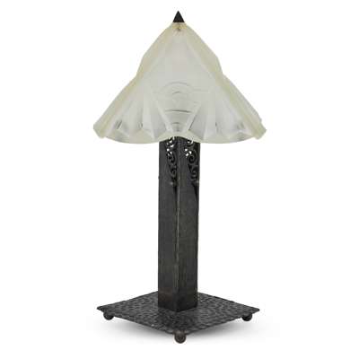 wrought steel, with moulded frosted glass shade, indistinctly signed to base