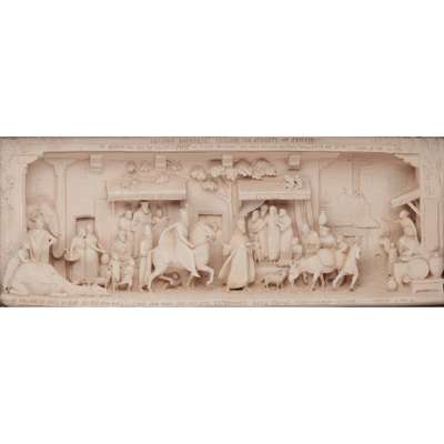 Note: This terracotta panel of 1884 is based on the bible story in Esther Chapter VI. Haman is shown leading the King's horse, with Mordecai seated on it, through the city street. Onlookers, attracted by Haman's proclamation, appear from all directions displaying reactions of wonder, envy or gladness.