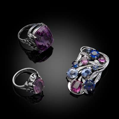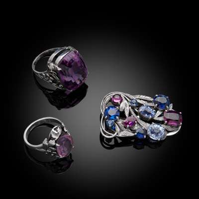comprising a RING, silver set with an amethyst stone, size N/O; a FURTHER RING, white metal, set with an amethyst stone, size L; and a CLIP BROOCH, white metal, set with synthetic rubies and sapphires, 4cm long