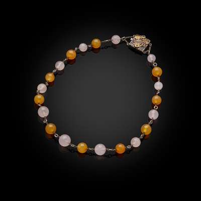 white metal, the clasp set with citrines, to a strand of rose quartz and hardstone beads