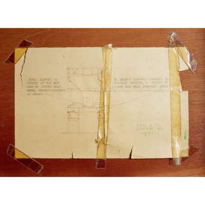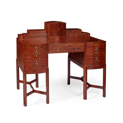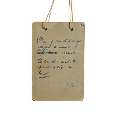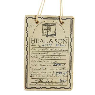 Note: The original pencil design for this desk, with instructions on how to open the secret drawers and dated 1931 is stuck to the inside of the central drawer. In addition, early Heal's label included with this lot, registration number R. 4759