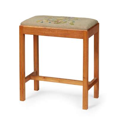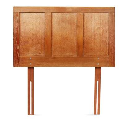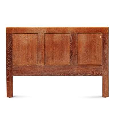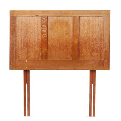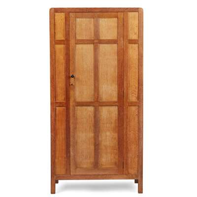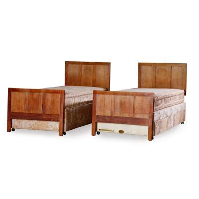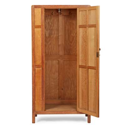 oak, comprising a WARDROBE, oak, 91cm wide, 183cm high, 51cm deep; a DRESSING TABLE, oak with mirrored plate, 92cm wide, 142cm high, 47cm deep; a '952' SIDE CHAIR, with rush seat, 40cm wide, 91cm high, 42.5cm deep; an OCCASIONAL TABLE, 41cm square, 69cm high; a STOOL, 52cm wide, 61cm high, 28cm deep; and TWO SINGLE BEDS, headboards (including modern divan mattresses and bases) 91cm wide, 105cm high; footboards 91cm wide, 67cm high