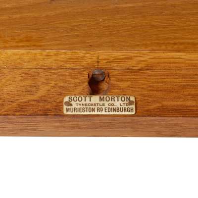 oak, carved with a design of the burning bush, bears a maker's label under the seat rail SCOTT MORTON AND TYNECASTLE CO. LTD, MURIESTON ROAD EDINBURGH
