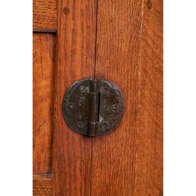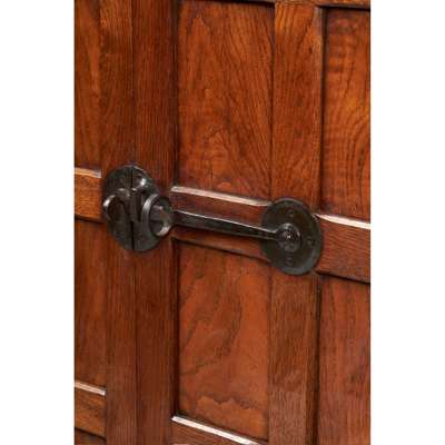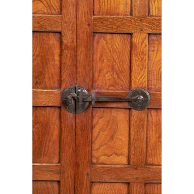 oak with carved mouse signature, patinated steel fittings