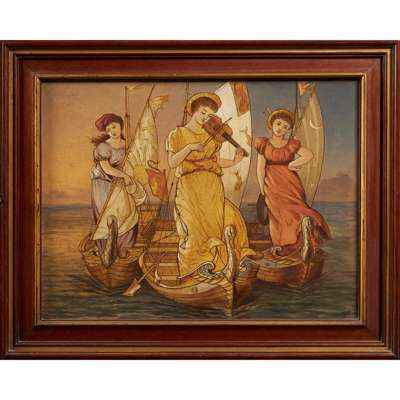 Note: The central painted panel in this cabinet is based on I saw three ships by Walter Crane (1845-1915), the original illustration appeared in Baby’s Opera published by Messrs. George Routledge & Sons, Ltd. in 1877.