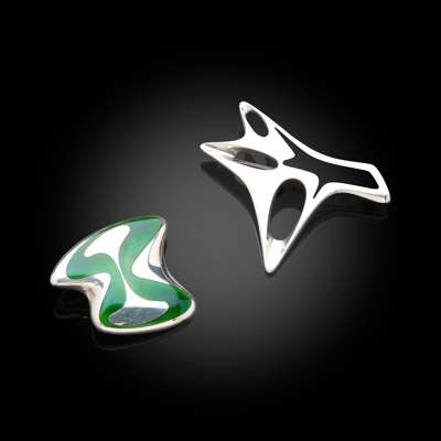 model 315, silver and green enamel, 4.3cm wide; together with an AMORPHIC BROOCH BY HENNING KOPPEL FOR GEORG JENSEN, DESIGNED 1956, model 323, sterling silver and black enamel, 7cm across, each with stamped maker's marks