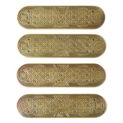 comprising FOUR FINGERPLATES, 28cm long; FOUR DOOR HANDLES, 5.5cm diameter; and FOUR ESCUTCHEONS, 6cm long, fingerplates with stamped manufacturer's mark WT&S