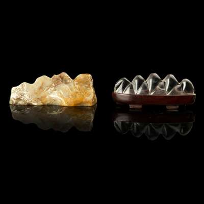 one carved soapstone brush rest in the form of a pointed mountain, one side carved in low relief with small houses in bamboo groves, the other side with six Chinese characters; the other a carved rock crystal brush rest of five-pointed mountain form with peaks and rugged surface, with a fitted wooden stand