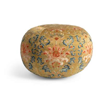 A pair of closely comparable spherical elbow cushions of similar shape and design, dated to the Qing dynasty 1780-1850, are in the collection of the Victoria & Albert Museum, accession number: FE.138A-1983; another pair of yellow-ground embroidered silk 'lotus' square cushions, dated to Qing dynasty 18th-19th century, was sold at Sotheby's New York, 29 September 2021, lot 948