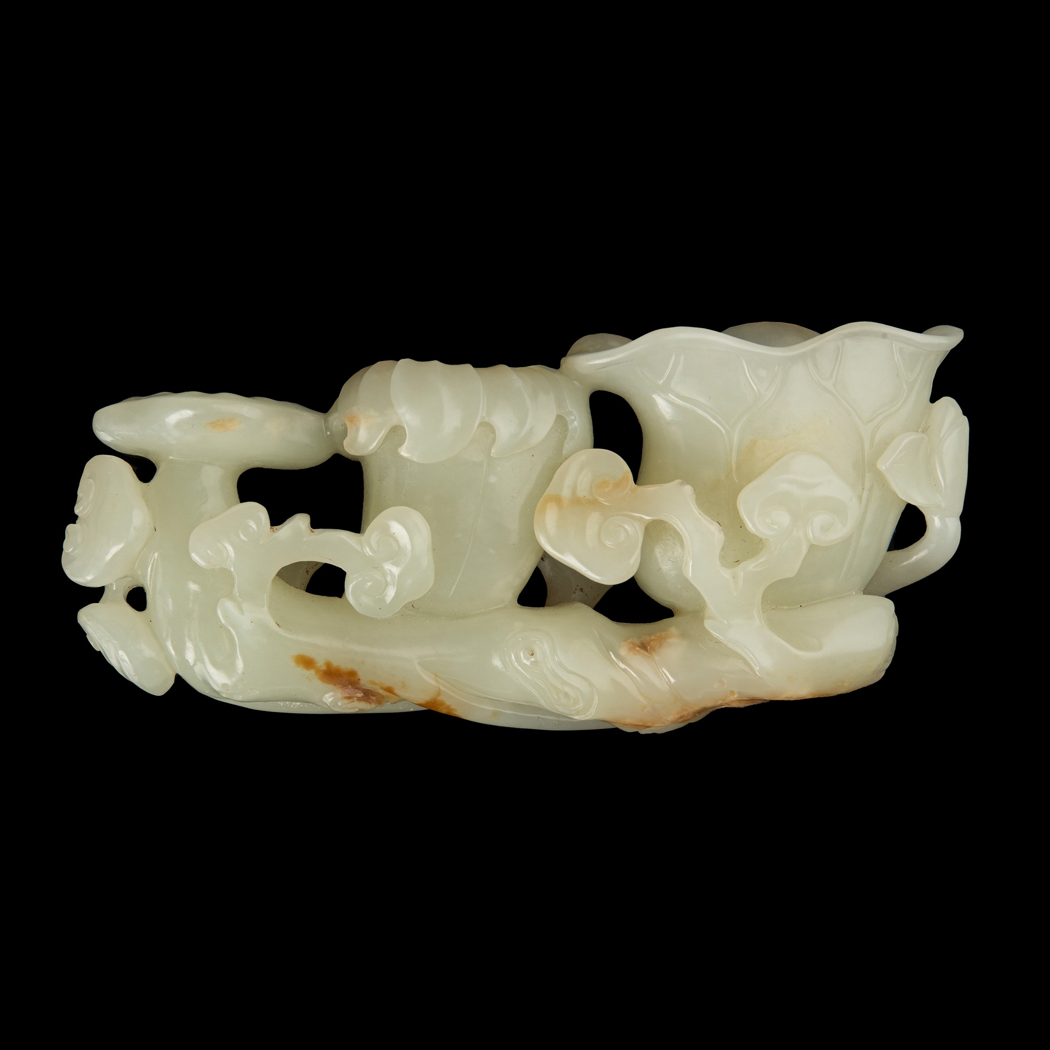 carved in openwork in the form of a branch of lingzhi sprig, with a large lingzhi head, a flower bud and leaf-form tubular vessel issuing upwards from the sprig, the stone of translucent white tone with some russet patches