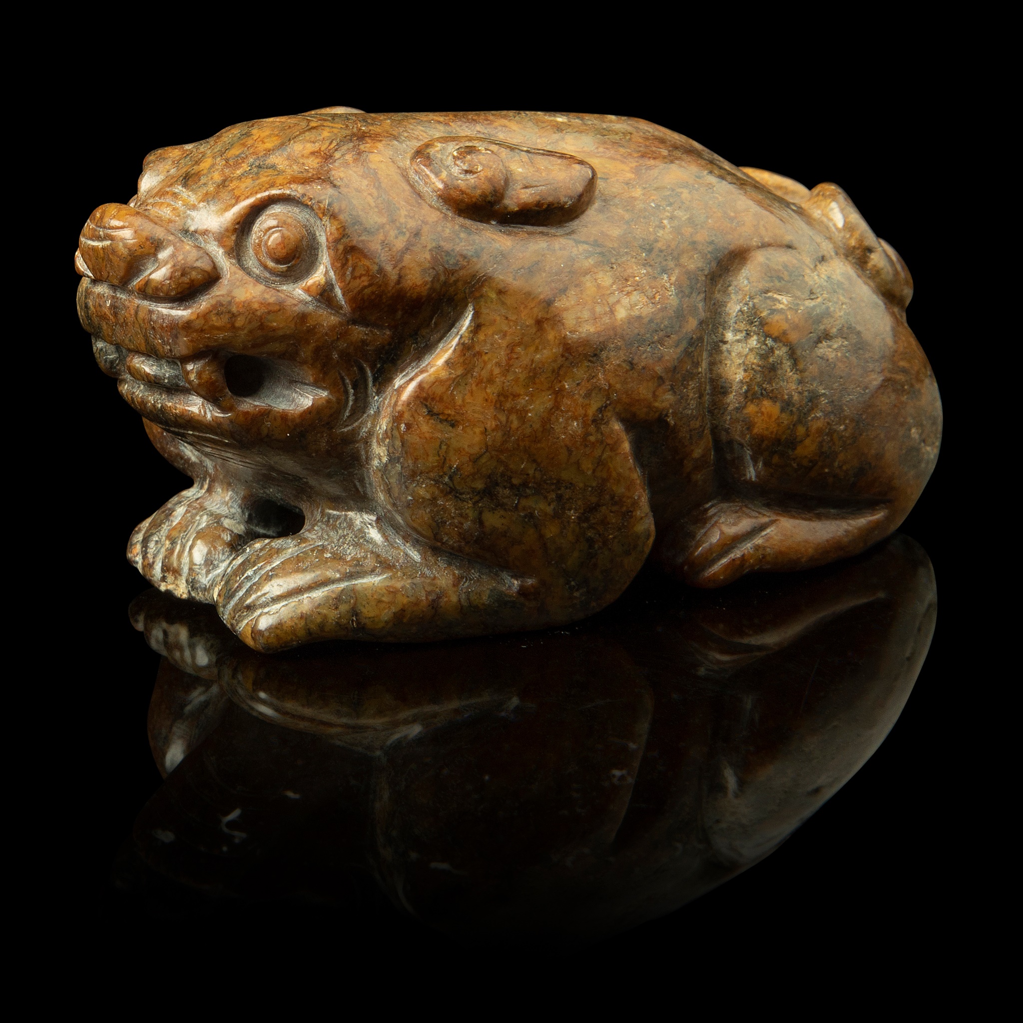 carved in the round of a recumbent mythical animal, its head looking straight and ears extending backwards, its tongue sticking out between sharp teeth, the stone of deep brown colour with russet inclusions