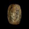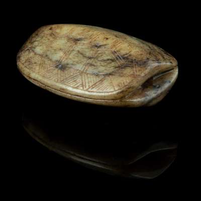 carved in the round in the form of a naturalistic tortoiseshell on both sides, an aperture running through the centre, the stone of uneven brownish celadon colour with black streak inclusions