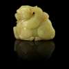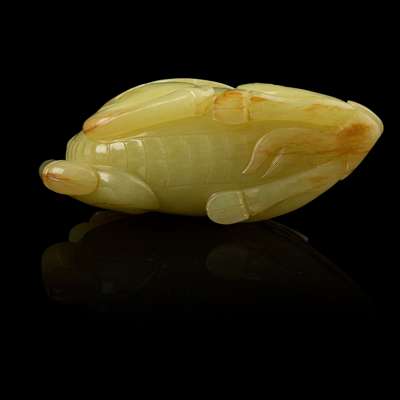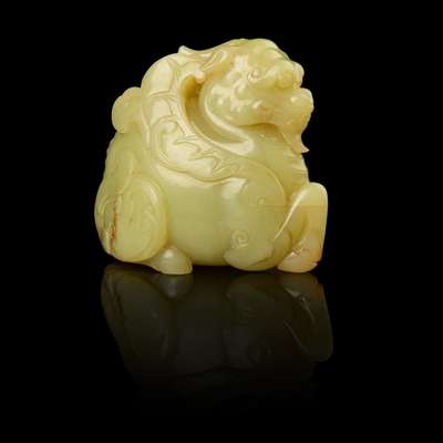 well depicted recumbent with the hind legs and front left leg tucked beneath the body, the right leg against the ground, rendered with its head looking straight ahead, the horned beast further detailed with bulging eyes, curled whiskers and a winged body, the stone of a yellowish celadon colour highlighted with russet veins