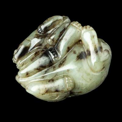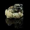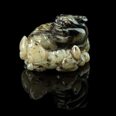 carved with a unicorn qilin together with its cub, both in the recumbent position, the minutely carved head looking backwards to the cub, the stone of uneven celadon and black colour