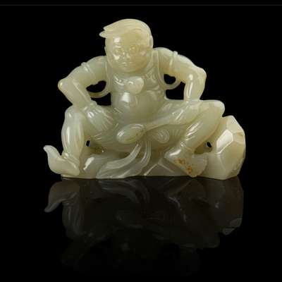 CELADON JADE CARVING OF A SQUATTED BARBARIAN