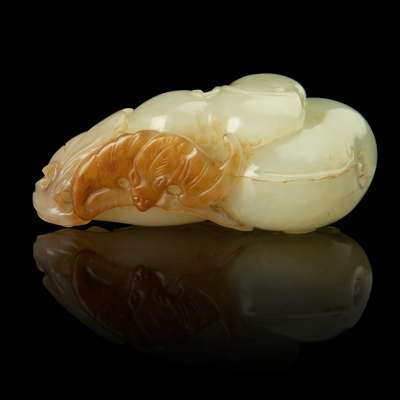 finely carved of a double-gourd form, decorated with a further gourd and a flying bat in high relief, the stone of even white colour, the bat highlighted in russet colour with the original stone skin