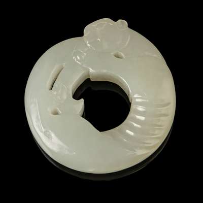 the circular pendant carved in the form of a tiger biting its own tail, the stone of even white tone