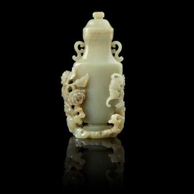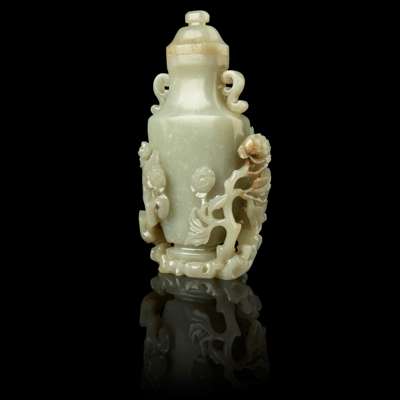 of flattened, high-shoulder form, rising from a rocky base, the body flanked by flower branches and a hovering bat, the jade of celadon colour with russet inclusions