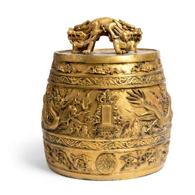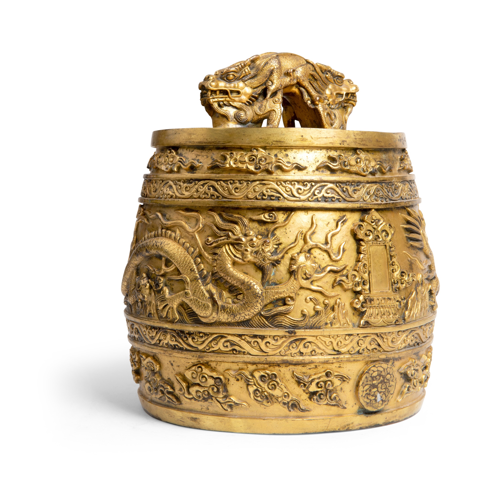 heavily cast, the cylindrical body boldly surmounted by a pair of addorsed dragons each crisply cast with a finely scaled arched back, the horned head raised with mouth agape bearing fangs, and supported on powerful extended front claws, the gently convex sides cast in sharp relief with a pair of animated five-clawed dragons striding amidst roiling seas and fiery clouds, centred to either side with an upright rectangular cartouche set on a tiered lotus stand and ornamented on three sides with symmetrical cloud scrolls, all between bands of formal foliate scroll and stylized clouds
