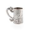 the 'double-skinned' cylindrical vessel tapering up with exterior repoussé in relief with a continuous scene of scholars at leisure amongst trees, rockwork and pavilions, a sinuous dragon-form handle set to one side, with engraved initials ‘MCSS’ in a shield-form cartouche, the base with a two-character maker's mark '澄記 (Cheng Ji)' in Chinese