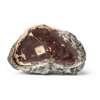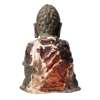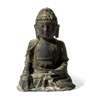 seated in dhyanasana pose, with right hand in bhumisparsha mudra and left in dhyanasana, wears a robe falling in naturalistic folds around the arms and legs and open at the chest, the face has a serene expression with eyes downcast, with elongated ears, the hair is dressed in curls surrounding the ushnisha