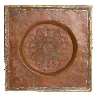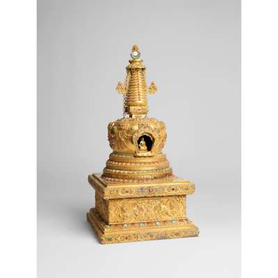 the reliquary cast on a waisted square throne decorated in relief with a pair of Buddhist lions in quatrefoil cartouches, below a circular platform of three inscribed steps supported on lotus bands, leading to a bejewelled domed stupa accommodating Bhaiṣajyaguru set within arched niche framed by flame scrolls, all supporting a harmika and a set of thirteen-wheeled spire with inscriptions and parasol, topped with a sun-moon finial, and flaming jewel pinnacle, variously embellished with turquoise and coral beads
