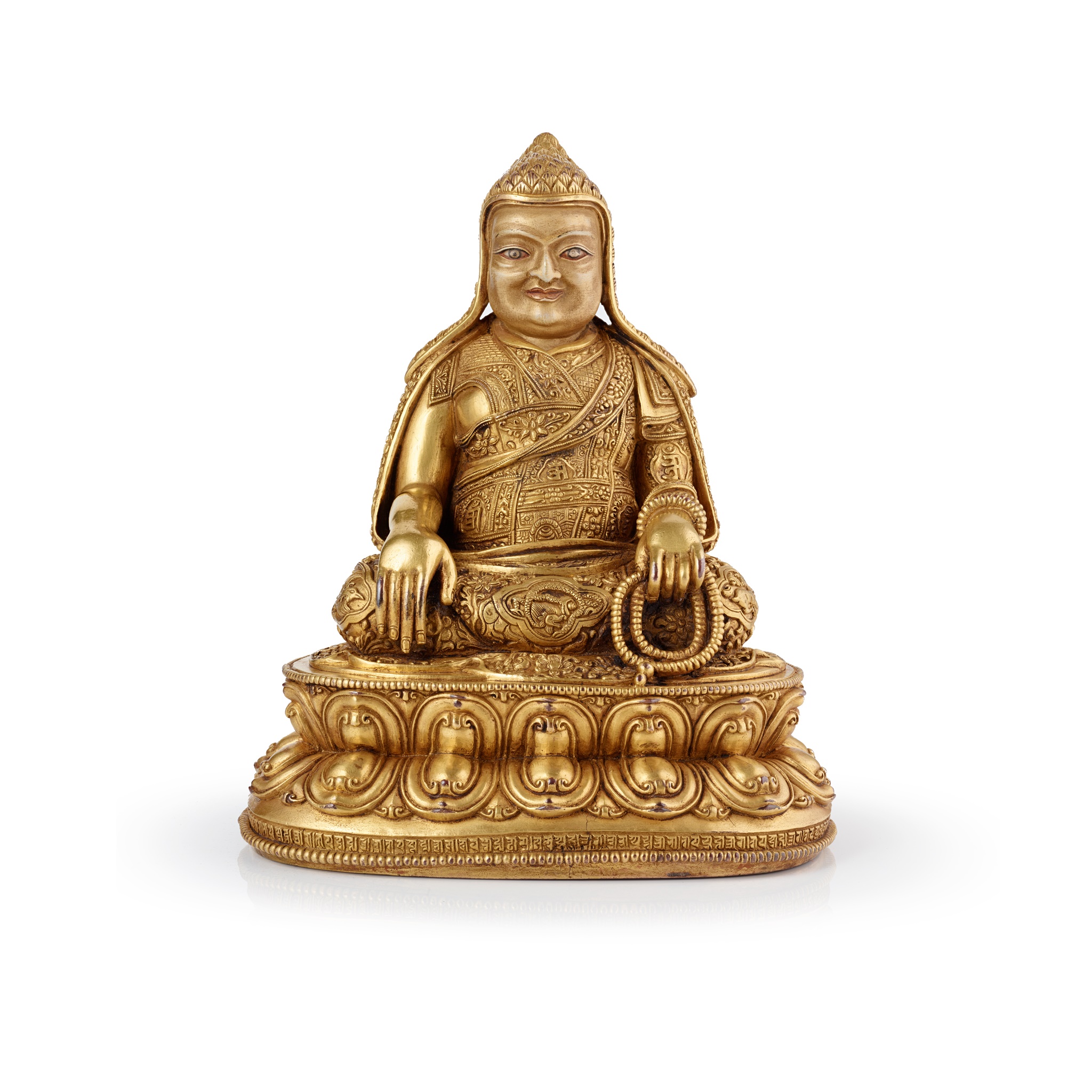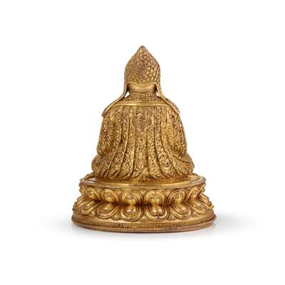 Note: A copper alloy figure of a Sakya school lama, dated to ca. 16th century, is depicted similarly with this lot with corpulent contours, both hands over his knees with the left hand holding a mala, was sold in Bonhams Hong Kong, 2 Dec 2020, lot 1002