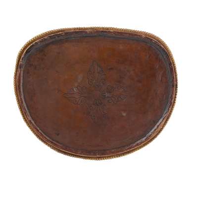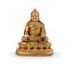 cast seated on a double-lotus throne, right hand in bhumisparsha mudra, left hand rested on knee holding a rosary wrapped around his wrist, wearing a richly decorated robe, his face with large eyes in benevolent expression surmounted by the pandita cap of the Gelug order, the base sealed with a plaque incised with a crossed vajra