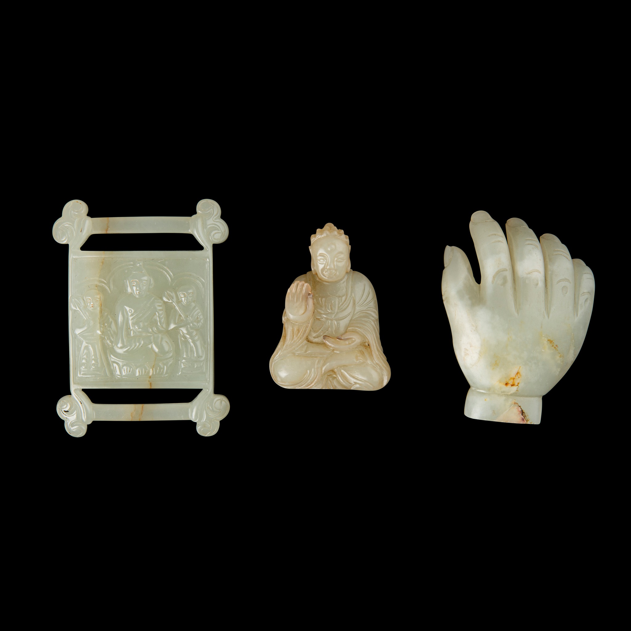 comprising: one white jade seated Buddha with his right hand in abhaya mudra, minutely carved wearing drapery robes, 3.5cm high; a naturalistically carved pale celadon jade hand with fingernails, 4.2cm high; and a pale celadon jade cloth buckle with its square panel carved in relief with a seated Buddha flanked by two attendants, 5cm high