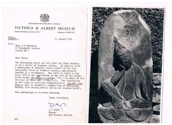 With an original letter dated 14 August 1970 from John G. Ayers, the then keeper of the Far Eastern Section in the Victoria and Albert Museum, addressed to the abovementioned 'Miss M C Debenham', the current owner's aunt. The letter identifies the stele is of Japanese origin and dated the stele according to the inscription.