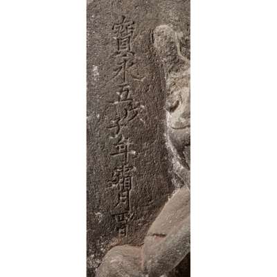carved with Avalokitesvara seated contemplatively in royal ease posture on a throne, his right foot over left ankle and folded leg half raised, allowing his right elbow to gently rest on his inner right thigh, head tilted to right and sensitively rested on right palm, his eyes closed, face in serene expression, dated to right of the figure on the mandorla 'Fifth year (Year of Tsuchinoe Ne) of Hōei era, Fourth of Shimotsuki Month (Month of Frost, eleventh month in the old calendar)', carved on the opposite with a male devotee's holy name 'Rishō Myōtei Shinji' (?), centre of the base further with 'Nakazawa Shi'