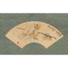 ink and colour on paper of fan shape, further mounted on textile, depicting a kneeling arhat tying up his shoelace, inscribed on the upper right including the year of Yi Chou, corresponding to 1925AD, and two red seals reading 'Meng Shi' and 'He Yin'