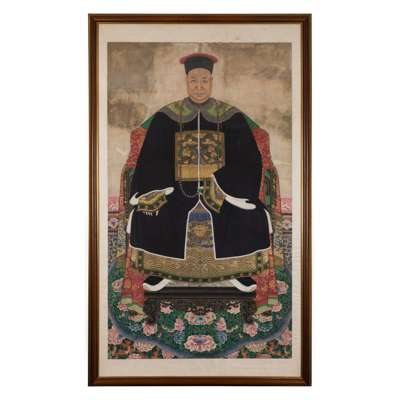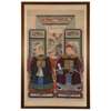 ink and colour on papers, one depicting a seated couple before a half-folded floor screen showcasing three paintings, the figures wear black robes with a bird rank badge; the other painted with a male court official wearing a black robe with a ninth-rank 'quail' badge, sitting on a chair covered with red cloth on an elaborate floral floor, framed