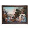 depicting a scholar and his attendant crossing a bridge on their way to visit a friend, who sits in the front garden with his attendant cooling him down with a fan and his two wives coming out from a luxury house, the scene set on the shore of a lake in a wild mountainous landscape, framed