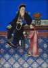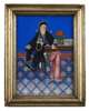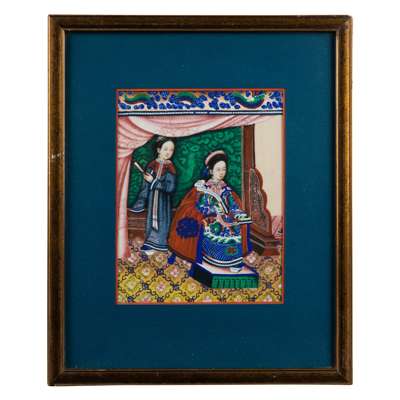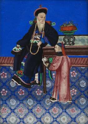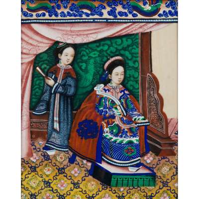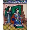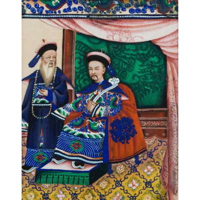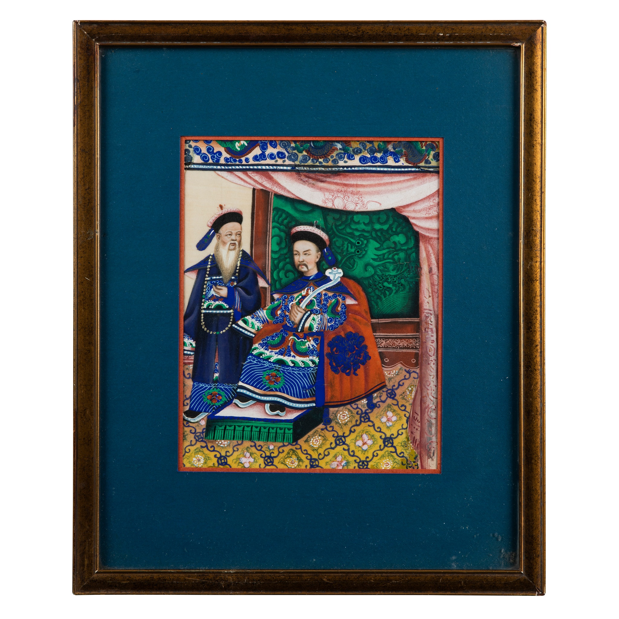 gouache on pith papers, comprising: one painted with a seated high-ranked male figure holding a ruyi sceptre accompanied by an official; one of a mirror image with a seated high-ranked female figure and a maiden behind; together with one depicting an elderly male figure seated leaning on a table to his left, the table displayed with melons on a raised green bowl, an attendant presenting a white ruyi sceptre, all framed