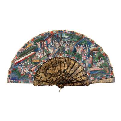 the paper leaves painted to one side with a large pheasant and bird with various flowers against a silvery ground, the other side with 'thousand faces' design with various small figures in a garden setting, each figure with finely detailed faces and applied silk clothing, the guards and sticks gilt-lacquer decorated against a black ground with small figures