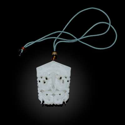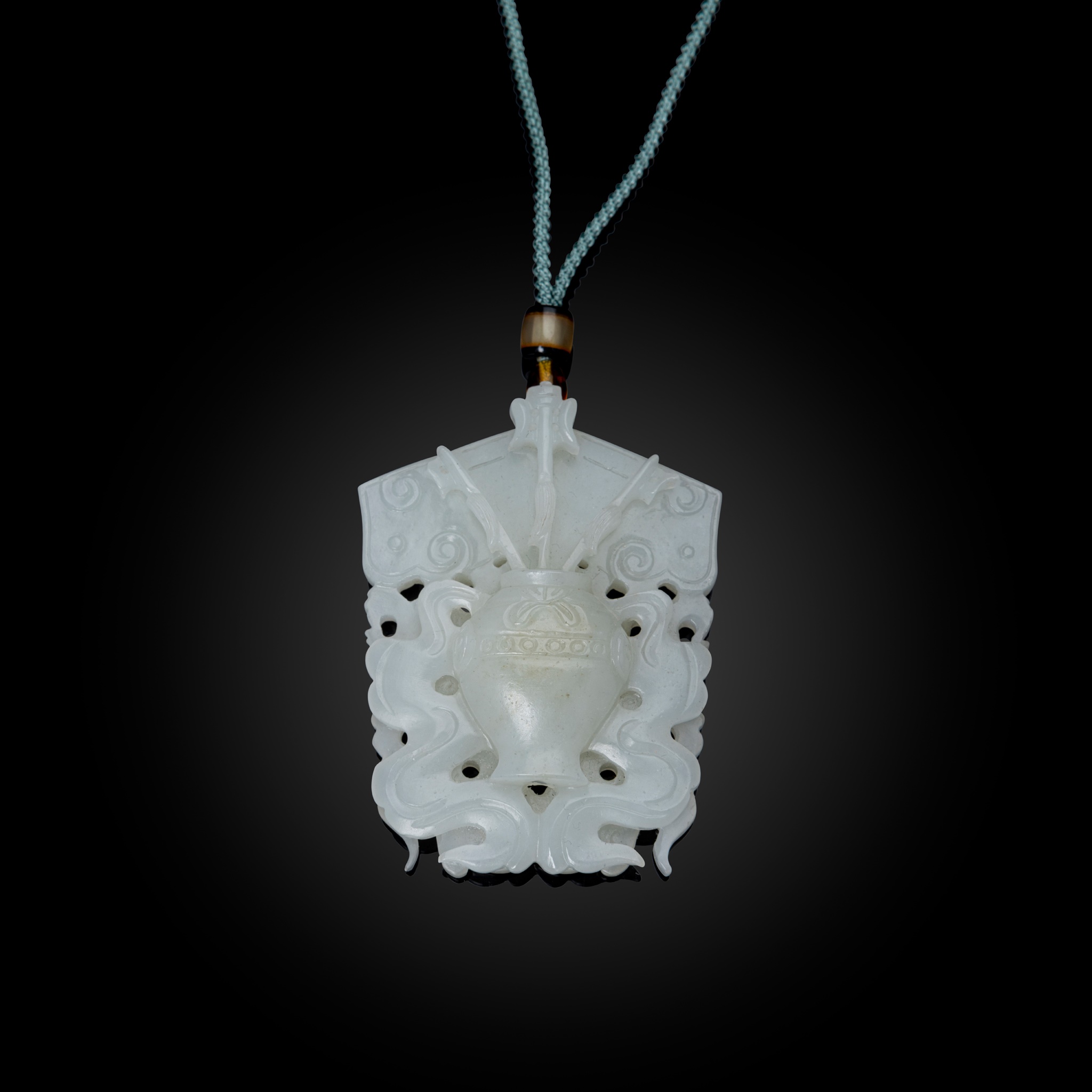 of pentagon shape, one side carved in high relief with a ribboned vase under a qing musical instrument, the reverse carved with two fish, the stone of even white colour