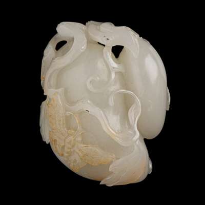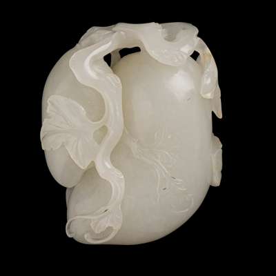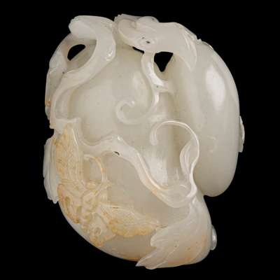 finely carved and pierced as a leafy stem bearing two ripe melons, a butterfly perched upon one of the fruits, the stone of even white tone with the russet inclusions cleverly worked into the carving to highlight the butterfly